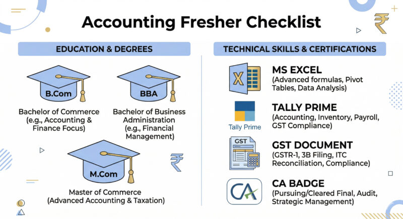 The top skills are: Microsoft Excel (VLOOKUP, Pivot Tables), Tally Prime or QuickBooks, GST and TDS basics, attention to detail, and good communication. AI tools like ChatGPT and Microsoft Copilot are increasingly valued. Learning even the basics of one cloud accounting tool — like Zoho Books — sets you apart from most freshers.